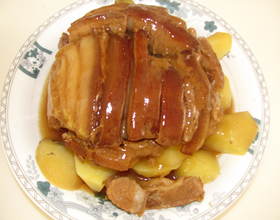 把五花肉放入油里炸到肉皮呈金黄色捞出。