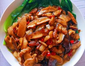 香菇洗净切片,小火炒完五花肉不用刷锅,用煎出来的油炒蒜末,小米辣,放香菇,一定要小火慢慢的把香菇的水分炒出来