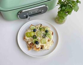 水果根据自己喜好添加,马蹄爆爆珠没有可不放,吐司放入摩飞多功能煎锅中煎制焦黄色就可以啦,无需放油,全程中火煎制