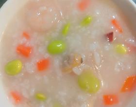 锅里放油放入海鲜煸炒,海鲜撩出,留下汤汁,放入大米和水煮开,放入毛豆、胡萝卜、小火煮致浓稠稀粥,再放入煸炒好的海鲜,煮开即可,口味咸淡自己调整