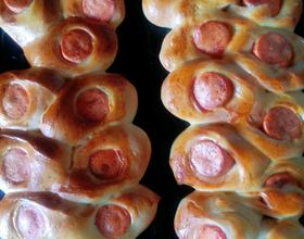 - 6. 用面团把火腿肠裹起来,边口处捏紧