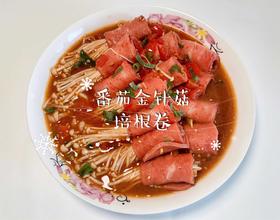 取一小撮金针菇放到培根中卷起来,用牙签固定