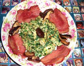 芹菜叶炒鸡蛋可以添水炖一会。培根小火煎,出来的油可以煎香菇。