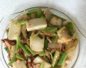 再将芹菜加入略炒,最后加入年糕片,分别加入少量盐、生抽、鸡粉、一起翻炒至熟。