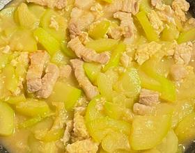 翻炒均匀后倒入鸡蛋和五花肉