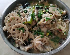 - 6. 加入蔬菜后煮熟后,将鱼骨蔬菜捞出放盆子,接着锅里加入腌制好的鱼片,煮熟。
