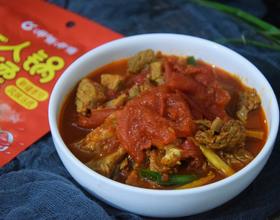倒入牛腩块,加入整包呷哺呷哺新疆番茄风味汤底,翻炒均匀