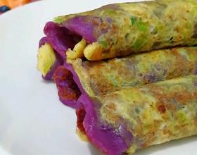 准备好烀熟的紫薯、鸡蛋、葱花、还有忘记拍照的面粉、盐和食用油。