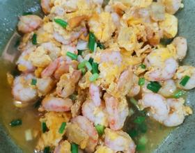 热锅,加油和姜粒,6-7成热,起姜香,倒入搅拌好的虾鸡蛋羹,慢慢翻至凝固。