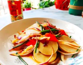 素鸡和胡萝卜切薄片。烧一点开水,水开后焯水素鸡胡萝卜。有个一分钟就可以了。