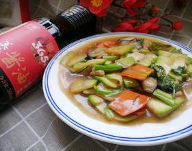 准备香畴美汁酱油,西葫芦,香菇,胡萝卜改刀切片备用。