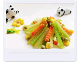 锅中放水,加入食盐,水开后分别放入芹菜,胡萝卜时间约1分钟,玉米粒和豌豆浮起即可
