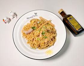 放入生抽10g,鸡粉2g,老抽5g,火腿丝炒匀