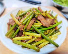 蒜苗在之前先煸一下,烂一些,然后放五花肉下去煸炒。