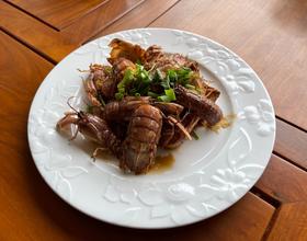 把虾爬子放入锅中翻炒,使虾爬子煎至金黄色。