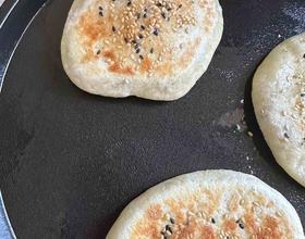 电饼铛下面刷油,烧饼上面刷油,上面撒一点芝麻,关上盖子等,好了会自动跳,你不放心可以打开盖子看看,我第二锅没注意有点焦了