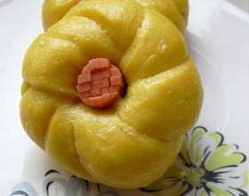- 6. 取一小截火腿肠,在顶部纵横各切几刀,但底部要保持连接。然后放在绕好的花形面坯中央。