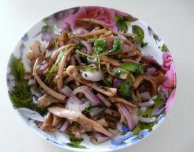 炒锅从新放火上,倒入色拉油烧热,加入孜然粒,炒出香味,倒入鱿鱼,翻炒。