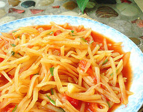 这道菜不必炒很长时间,否则土豆丝就不脆了。