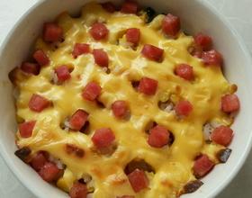 - 2. 鸡蛋打散,各种菜和火腿肠都切小丁,芝士切条,拨出一点火腿肠粒备用。
