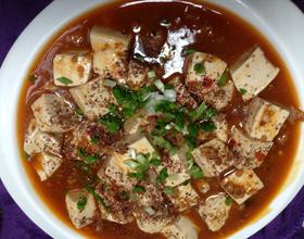 - 4. 汤汁煮开后,倒入沥好水的豆腐,大火烧开,沟薄芡即可起锅装盘。装盘后,在上面撒上一层花椒粉,别起锅烧点热油淋上,再撒上葱花即可。
