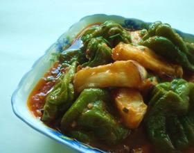 锅里加油比平时烧菜多些,油热7成,加切条辣椒炸