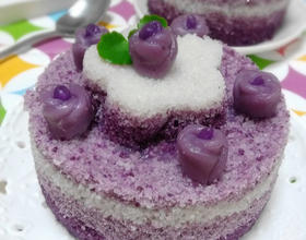蒸锅内放水,纺纱布,无底的慕斯模具内壁抹一层油直接放到纱布上,用勺子先把深紫色的米粉勺到模具里千万不要压,用勺子轻轻的抹平,然后勺上浅紫色米粉用勺子轻轻抹平。再勺上白色米粉,最后再勺上浅色米粉用刮板轻轻抹平