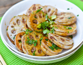 莲藕片不必太厚,半厘米最好。每片莲藕夹肉的那一面都要粘上淀粉,这样不容易散开。煎制时要用小火。烧制时不必加太多水,水性调料加一点儿水就可以了,莲藕夹已经煎过,入味儿即可。根据自己口味儿,加入适量的盐,我没有加,只用了生抽。