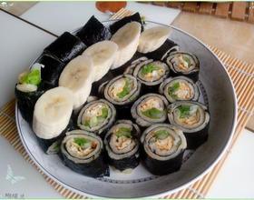 - 1. 准备食材,白面,鹰栗粉,鸡蛋,葱,香蕉,牛奶,寿司紫菜。
