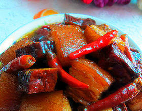 卤香干烧红烧肉即成。