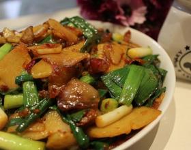 准备好材料:过水煮过的五花肉,土豆切片洗净,蒜苗切节,青椒。