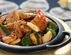 3、 烧热锅, 放入适量的油, 煸炒豆瓣酱, 注意火不要大,免得炒糊了;下入五花肉片煸炒,再加入香干一起炒,可以放入适量的料酒和生抽稍煮入味;