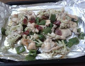 将蔬菜铺于烤盘底部,在腌制好的鸡肉中,倒入蜂蜜搅拌均匀,然后将鸡肉、香肠垒放于蔬菜之上。