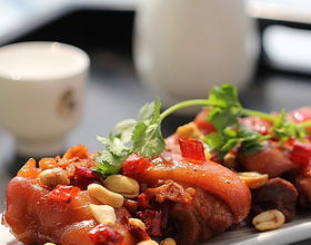 4、 将干辣椒段和猪手同时下锅煸炒一下, 如果盐味不过可以加入点盐调味; 最后起锅前加入熟花生米即可;