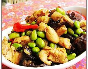 当鸡丁变白时,加入黑木耳和熟毛豆翻炒。