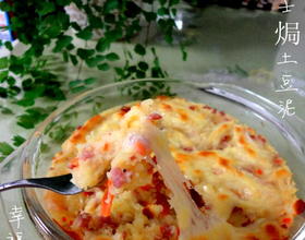 将土豆泥放入烤碗,表面铺一层马苏里拉芝士丝;