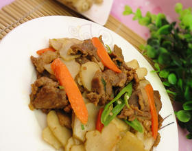 - 9. 倒入肉片炒,炒匀加入味精、胡椒粉、适量的盐,加入少许的开水炒匀出锅。