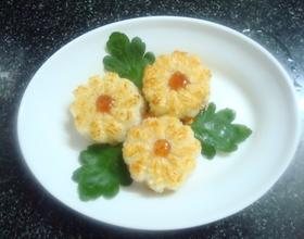 我用了真菊花的叶装盘,在煎好的饭团上面中间点上草酶酱.我的孩子们很喜欢吃哦.