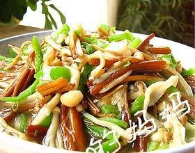 青椒丝快要发蔫时,放入金针菇段一起翻炒。