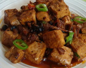 老豆腐切块。小葱切成末,干辣椒去籽切段。