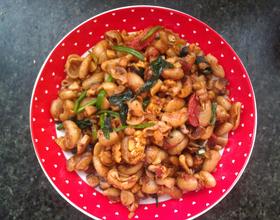 - 6. 炒一会儿后,接着放入菠菜和已下好的猫耳朵