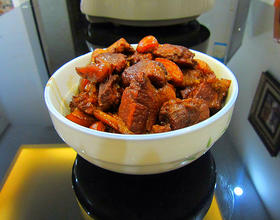 另起炒锅将焖好的五花肉倒进炒锅里,调入老抽,红糖,精盐炒匀上色。