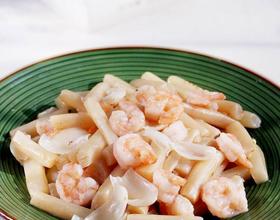 用油泡的方法让虾仁熟透,140℃左右的油温,以保留虾仁里微微的甜味。