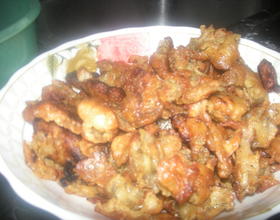 炒锅里放适量的菜油,油温只六成热将调好的鱼鳞小块小块的放入油锅里,炸制金黄色,就可以了