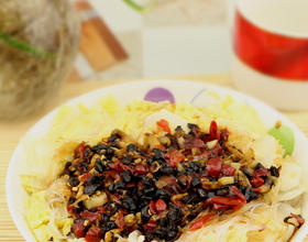 粉丝煮软后取一部分铺在盘底,铺上娃娃菜,再将剩余的粉丝铺在娃娃菜上。