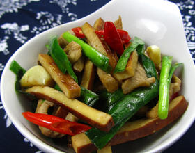 - 7. 再加入韭菜和红辣椒一起翻炒;