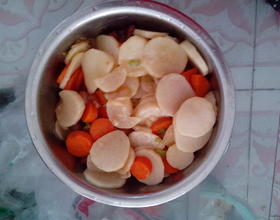 - 1. 山药弄起来比较的麻烦(我个人觉得啊 呵呵)带上一次性手套,因为咱们知道山药的汁沾在手上有点痒,很难受,注意点。洗净山药还有胡萝卜 ,切成小圆片。