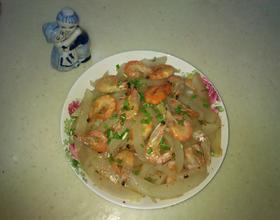 虾洗干净沥干水,白萝卜去皮切粗条,葱姜切丝。