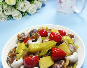 材料:肉螺、小米辣泡椒、红泡椒、姜片