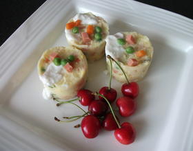 土豆用保鲜袋擀成泥,胡罗卜切丁与玉米豌豆一块焯水,鸡蛋火腿肠切丁备用。